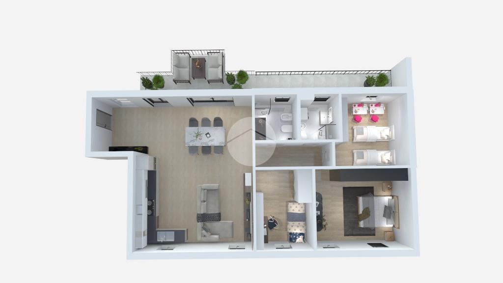 La zona notte è composta da due camerette, una camera matrimoniale e due bagni finestrati, progettati con finiture contemporanee e materiali di alta qualità.